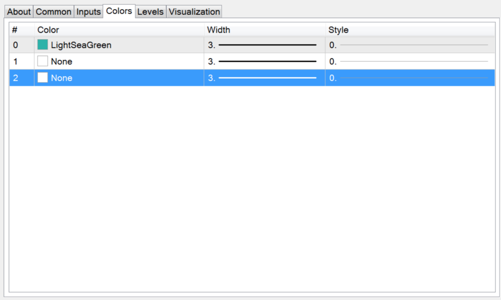 Pretty messy.  Let’s clean it up by removing two of the lines; the “yellow-green” and “wheat”, which represent the bullish and bearish indicators.  We only want to keep the “LightSeaGreen” line, which represents volume.  We’ll make those adjustments in the settings screen, on the colors tab.