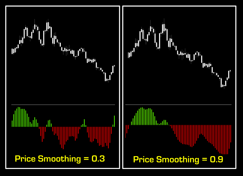 Index Smoothing: This setting is similar to price smoothing with respect to appearances; however, you’ll notice that each individual curve is smoother with higher index values. The default value is 0.3. *Note – this value must be smaller than 1.0. Below is an additional illustration of how this setting affects the indicator.