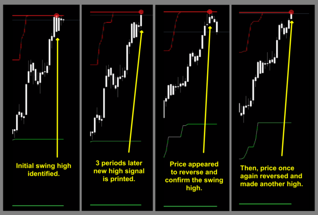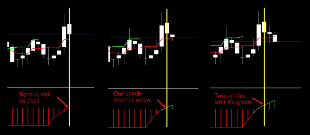 Within the code, the indicator will amalgamate/collate data and then backwards plot the highest or lowest value that corresponds to the specific candle, thereby giving you amazing signals.  Unfortunately, by the time it prints on the screen, time has elapsed, taking profits with it.  Sure, you could get into the trade…but this becomes a strong case for FOMO (Fear Of Missing Out) on what might be a profitable trade…or not.  Certainly a bad habit to get into.