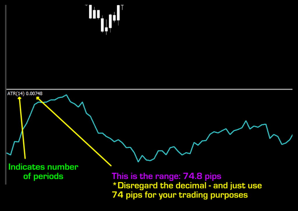 The second number; 0.00748 represents the number of pips calculated by the 14 period of the ATR. While the number shown is 74.8 pips, we disregard the “pipette”, or the decimal, and only use 74. Trust us, it makes things easier and will make virtually no difference in your calculations. You don’t even have to bother rounding it.