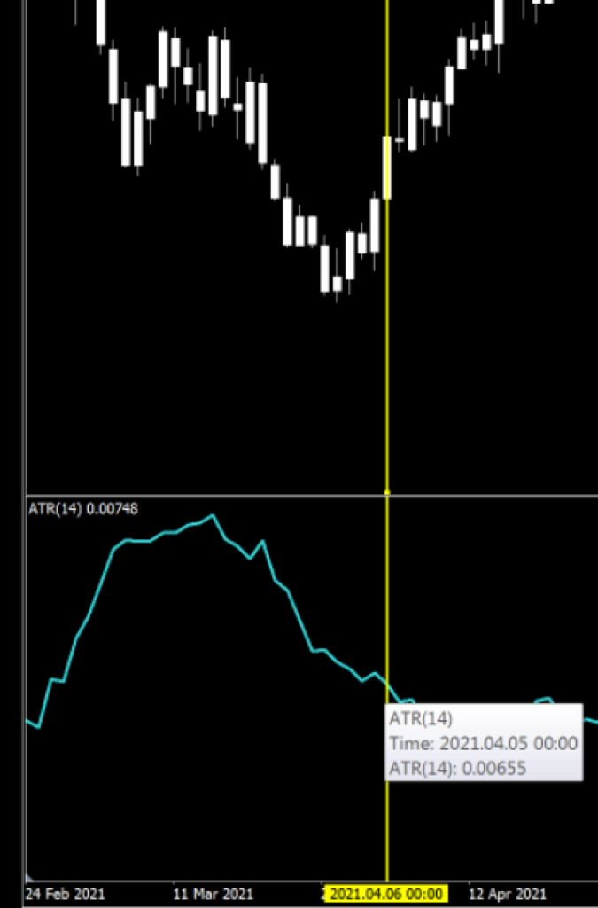 Here, we see that on April 5, 2021, the ATR of the EUR/USD on the daily time frame was 65 pips (remember to disregard the decimal).
