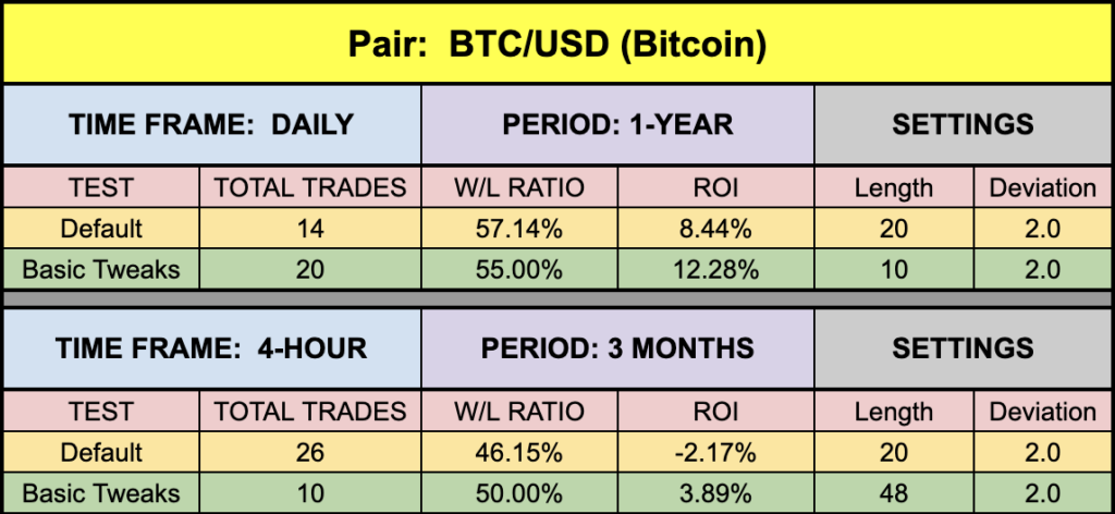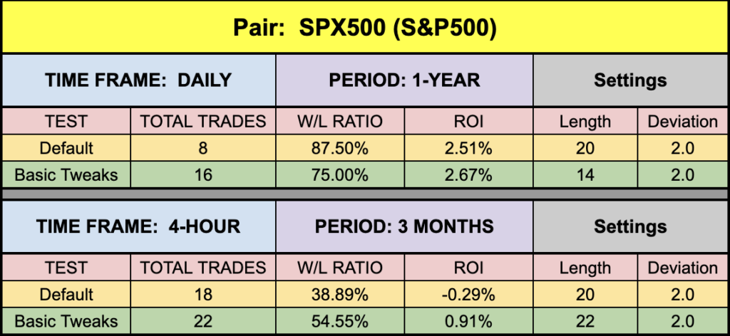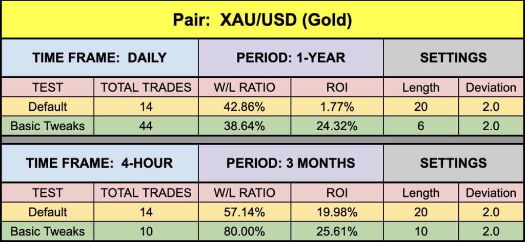 Well, we got us a mixed bag on this one. EUR and SPX500 were very soft and BTC was average, but XAU killed it, even on the 4-hour chart. Those weren’t even the best settings. However, keep in mind that we tested only one of the variables; the length. As mentioned earlier in the settings area, we’re going to look into why testing the deviation is beyond practical, but in the meantime, go noodle around with it. After all, the settings are just a “picture in time”, meaning that changing the testing dates by even one day will change the results. Besides, you’ve got 35 more pairs to play with.
