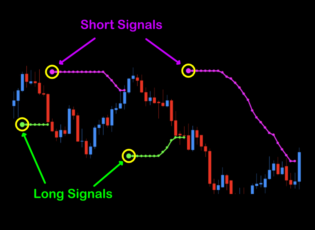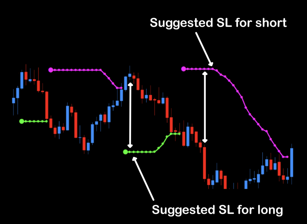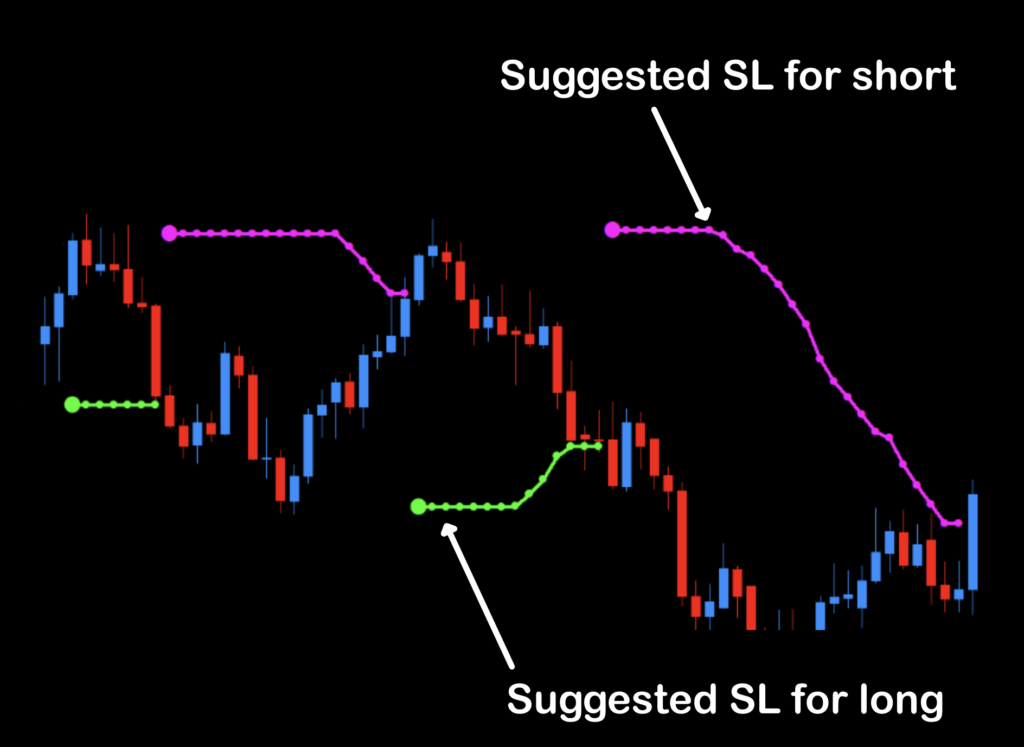 Now, we’ll look at the smaller “dots”. They represent a suggested stop loss level for each period based on how the line is created by the indicator.