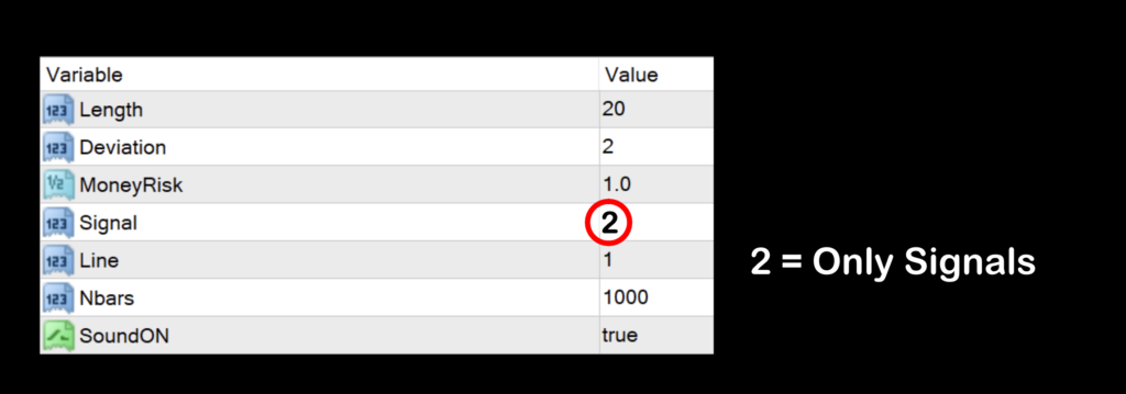 Signal: This is the setting which affords you the opportunity to change how the signal is displayed; Signal, stops, and lines. Change this to 2 and leave it there for clean charts.