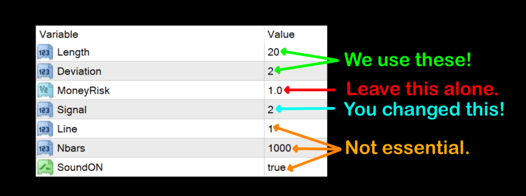 Money Risk: This setting is not needed. It is a multiplier of the upper and lower signal lines with respect to their distance to price. Just leave it at 1.