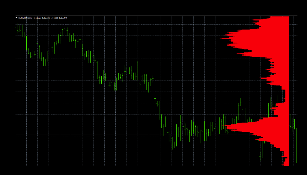 Below is a screenshot of an indicator which displays data in what can be described as a “market profile”. The data could be the amount of open trades at certain price levels, volume, long versus short positions, or other information. We don’t generally find these helpful, or necessary.