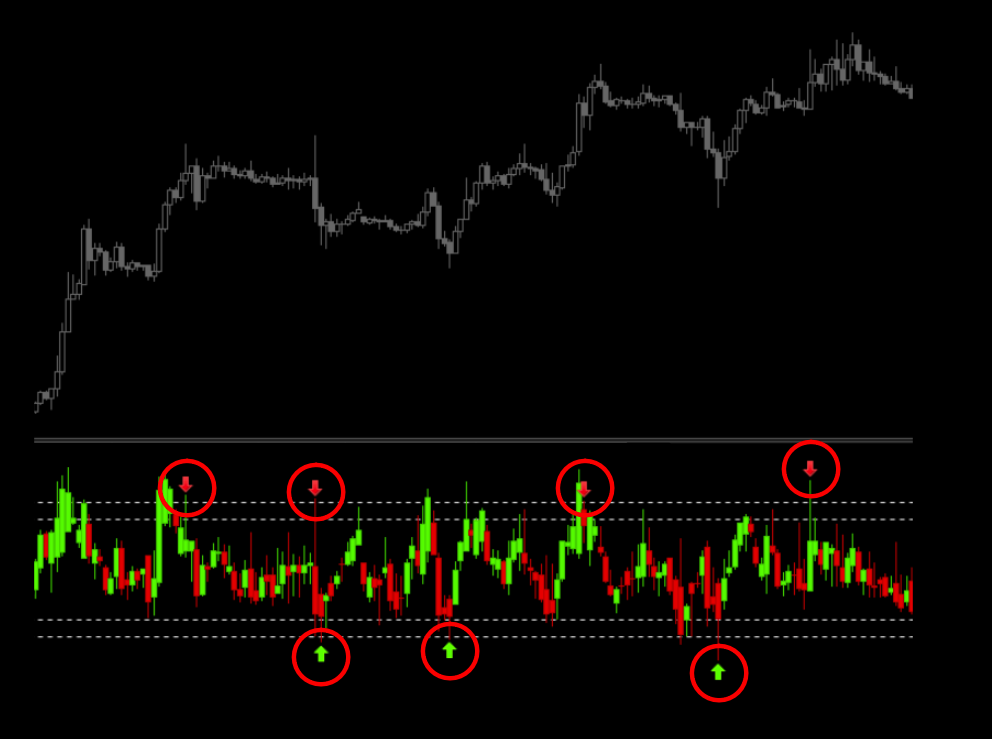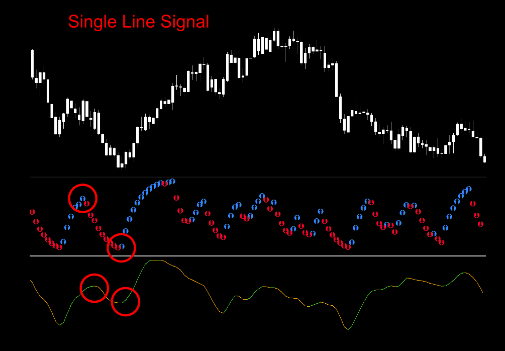 These below chart indicators create signals as they move up and down using various characters and colors. Check out a Single Line Signal indicator blogs we’ve posted; SCHAFF TREND CYCLE.