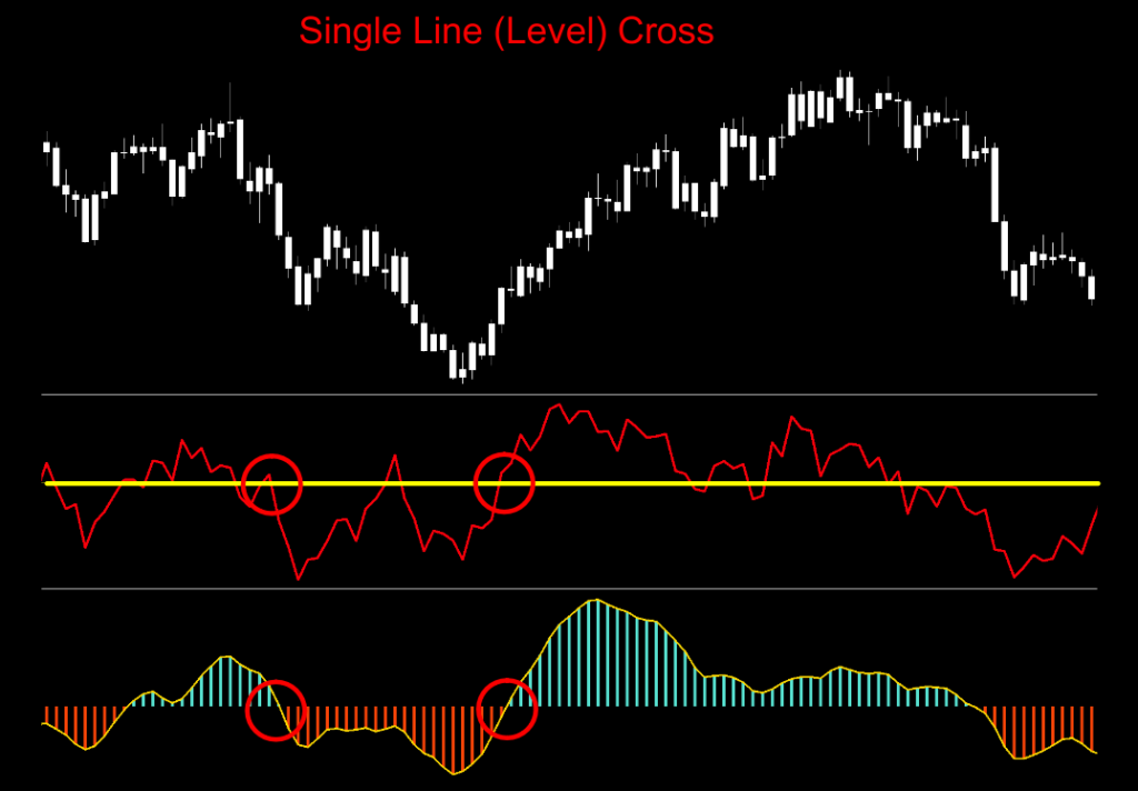 One of the most popular types of indicators, the Single Line Cross, generates a signal when the indicator’s main feature crosses a specific level. It has also been referred to as a zero cross in our literature. What makes this one of the most straightforward types of indicator to use is that it produces a binary decision; yes/no, short/long, or open/close. It can be a histogram bar, line (single or multicolored), a symbol (such as an arrow). We showcased a more efficient version of the MACD indicator in this blog after making a couple of changes to the settings which you may find helpful; ZERO-LAG MACD.