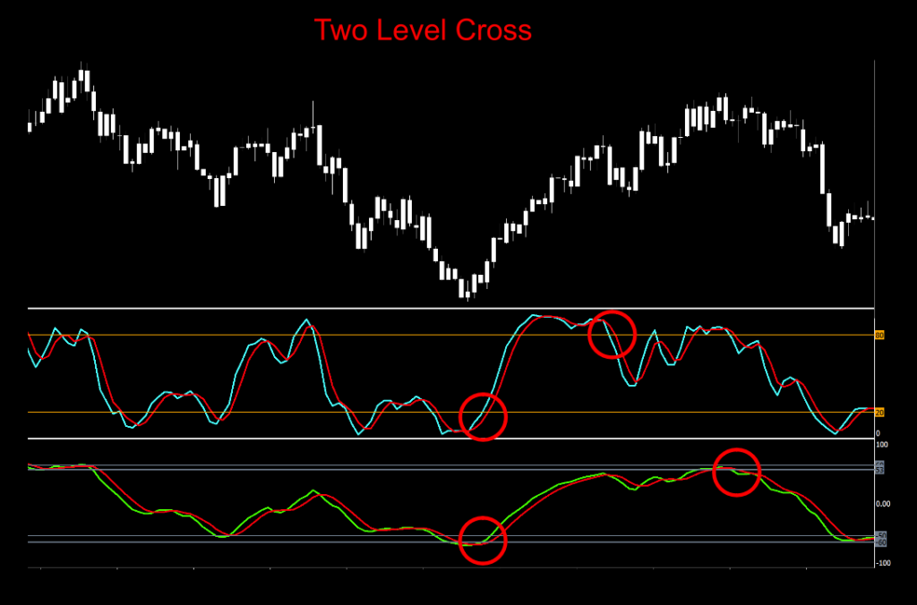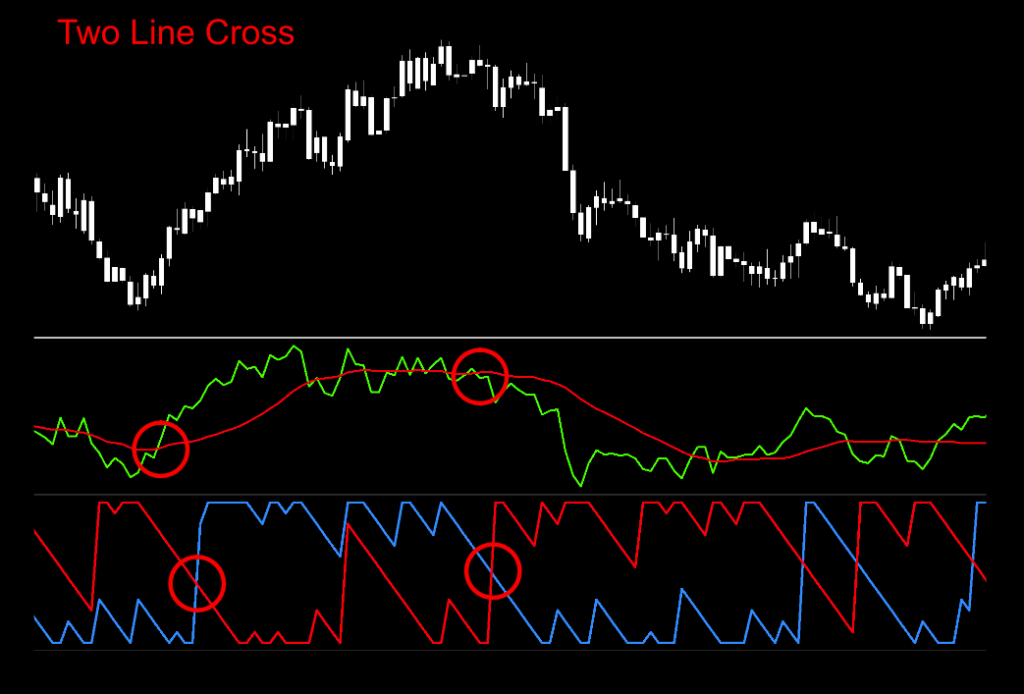 A two line cross below chart indicator is similar to what you might find in an on-chart indicator. The signal is generated when lines intersect. You might want to read up on one of these types of indicators we posted; the AROON UP & DOWN.