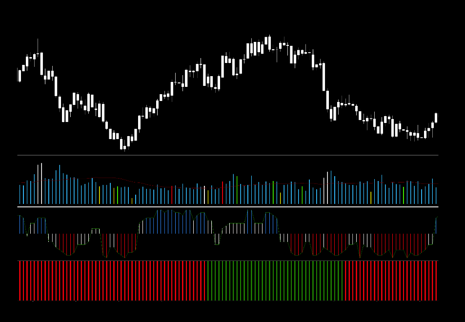 The examples below demonstrate that this type of indicator can appear quite different from others. The signal is generated when there is a “switch” between characteristics including; different colors, different bars, various symbols and other characters. Many volume indicators have this kind of appearance. Some may only be red/green and others are various colors to capture the magnitude of the histogram.