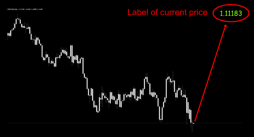 Another type of indicator places labels on the chart. This one, highlights the current pair’s price in bright bold numbers on the chart, for easy identification. Another great example might be one which prints out the ATR on the screen, without having the below chart version taking up screen space.