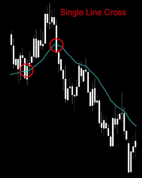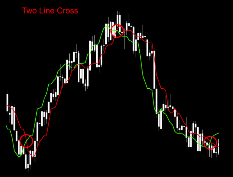 The intersection of two signal lines crossing indicates where a potential entry and/or exit may exist. Another popular two line cross is the use of an on-chart indicator paired with a moving average.