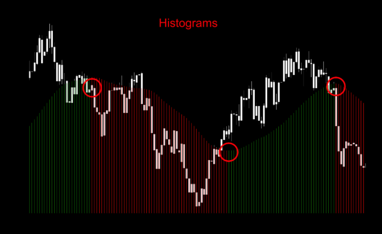 Color change and amplitude (height) provide the trader with an indication of long or short signal.
