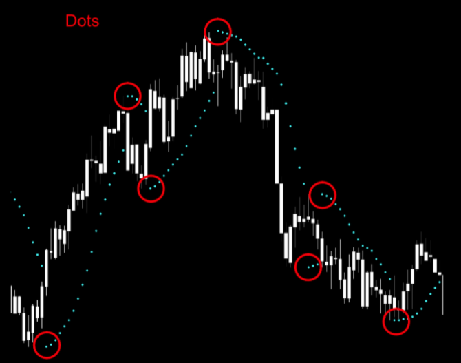 Dots above or below price indicate either an entry or exit signal (depending on the direction of your trade). They also indicate a possible change in price direction.