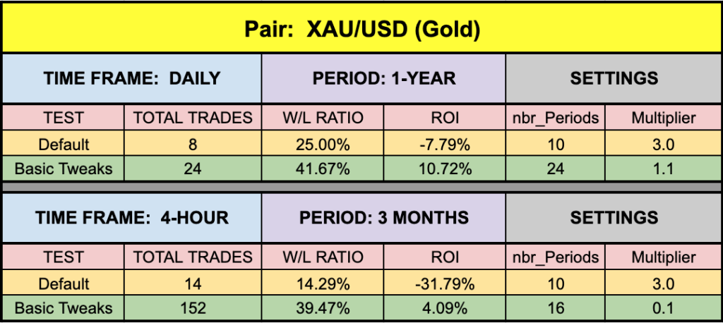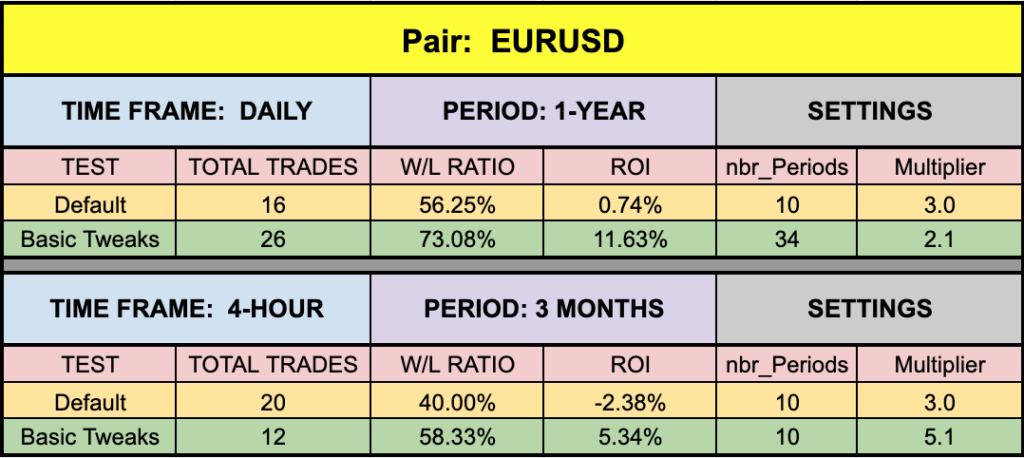 The green highlighted rows represent “basic tweaks” on the settings which returned better results. Are these the best? Not necessarily. Given that variables including testing date range and broker data are different from person to person, you may find better settings.