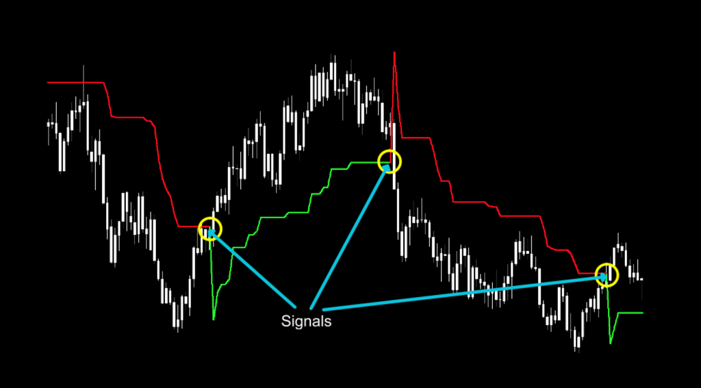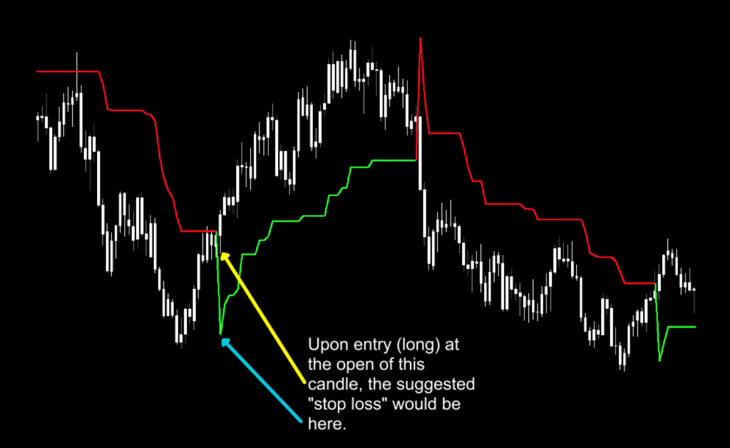 During our research, it was suggested that the line itself may be used to provide a stop loss level or as a point of price reversal; however, since we don’t advocate those methods in our trades, you can ignore those aspects of the indicator as noted in the screenshots below.