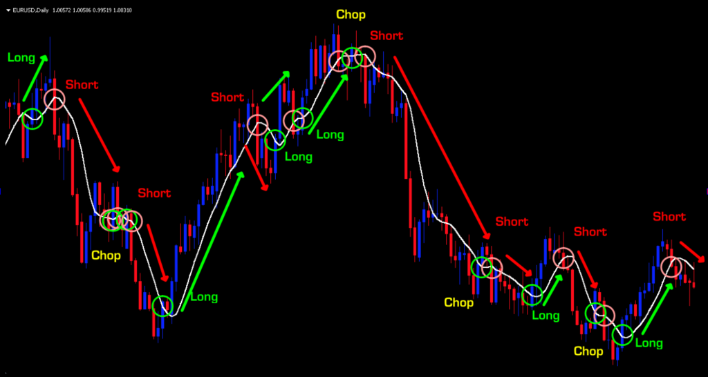 The irony of this indicator is that so much is going on in the background and yet, the only thing you need to concern yourself is whether price closed above or below the indicator line. How wonderfully simple is that? If you noticed, this indicator appears to “hug” price and react much quicker than other indicators based strictly on moving averages.