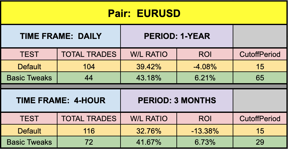 The green highlighted rows represent “basic tweaks” on the settings which returned better results. Are these the best? Not necessarily. Given that variables including testing date range and broker data are different from person to person, you may find better settings.