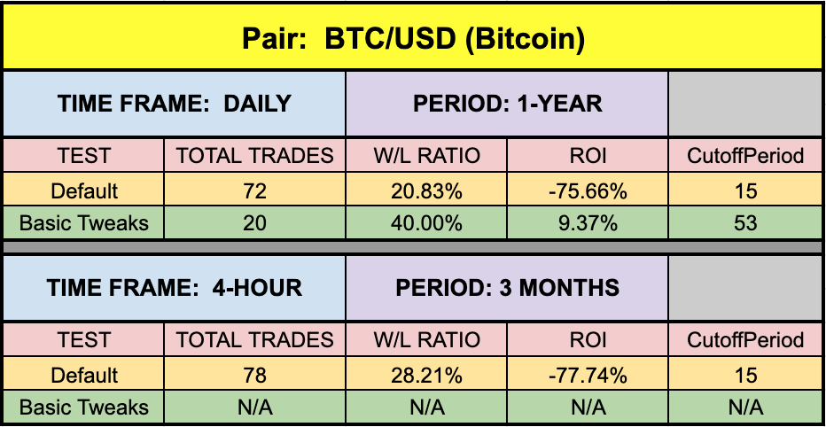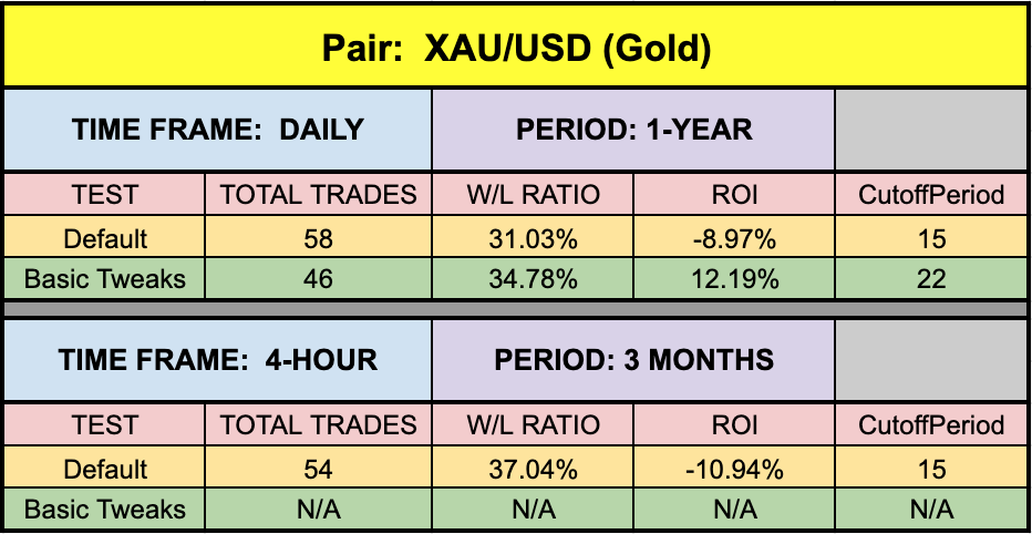 *NOTE: During the three-month period where we tested the both BTC/USD (Bitcoin) and XAU/USD (Gold) on the 4-hour time frame, there were no possible combination of settings that returned a positive ROI. This was first discussed in the Fisher No-Repaint blog and again in VP’s corresponding indicator profile YouTube Video.