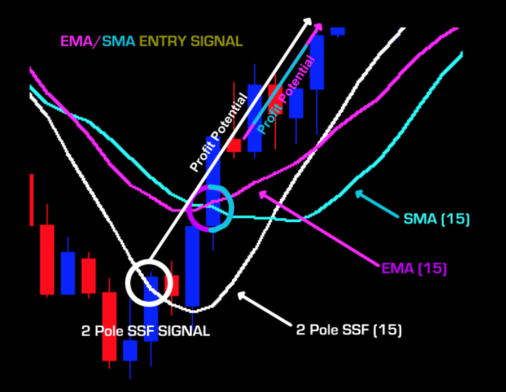 Below is a screenshot of the 2 Pole Super Smoother plotted with SMA and EMA lines to demonstrate Mr. Ehler’s objective.