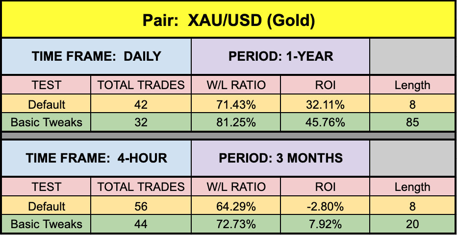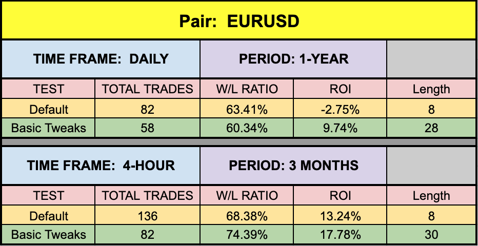 The green highlighted rows represent “basic tweaks” on the settings which returned better results. Are these the best? Not necessarily. Given that variables including testing date range and broker data are different from person to person, you may find better settings.