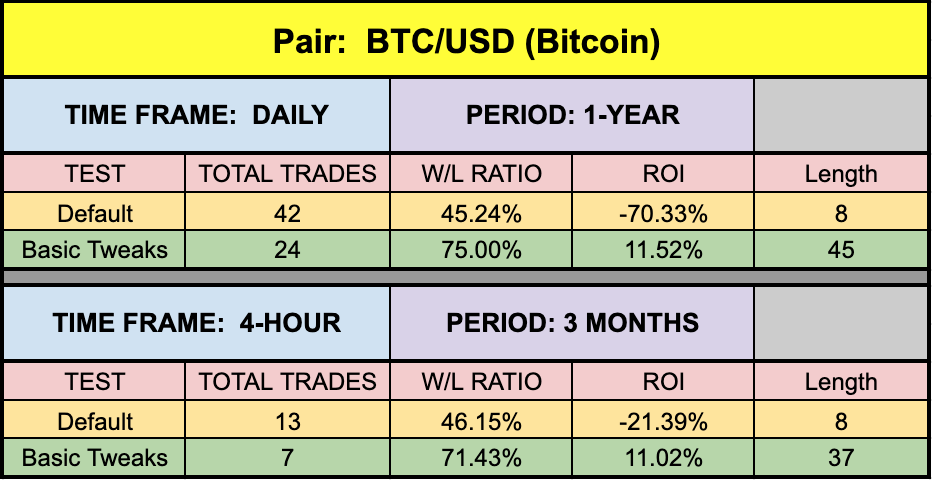 *NOTE:  During our testing, we noticed that in every occurrence, increasing the length returned better results.  This phenomenon can be clearly attributed to less “chop” of the indicator when price is ranging, or lacking any discernible trend.
