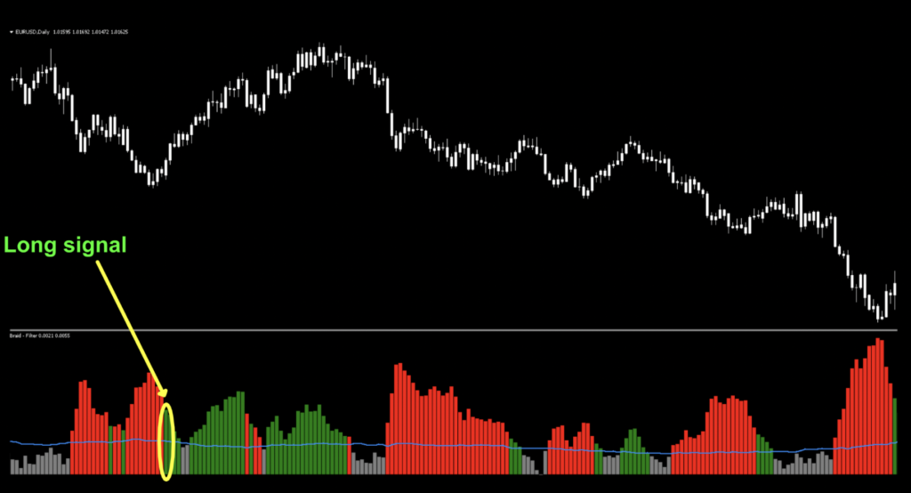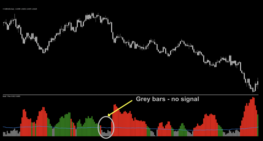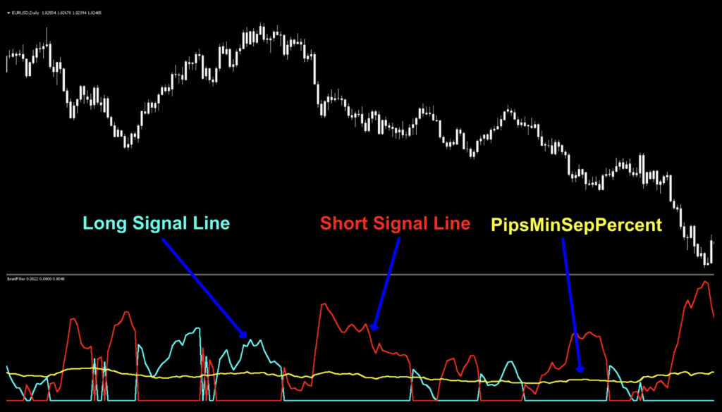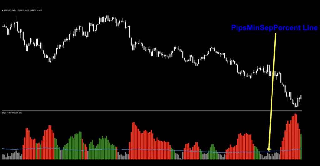 The last notation is the PipsMinSepPercent bar. You can either leave it in and ignore it, or just remove it via the indicator settings, as it serves no real purpose here other than to give you a sense of where the filter line lives.
