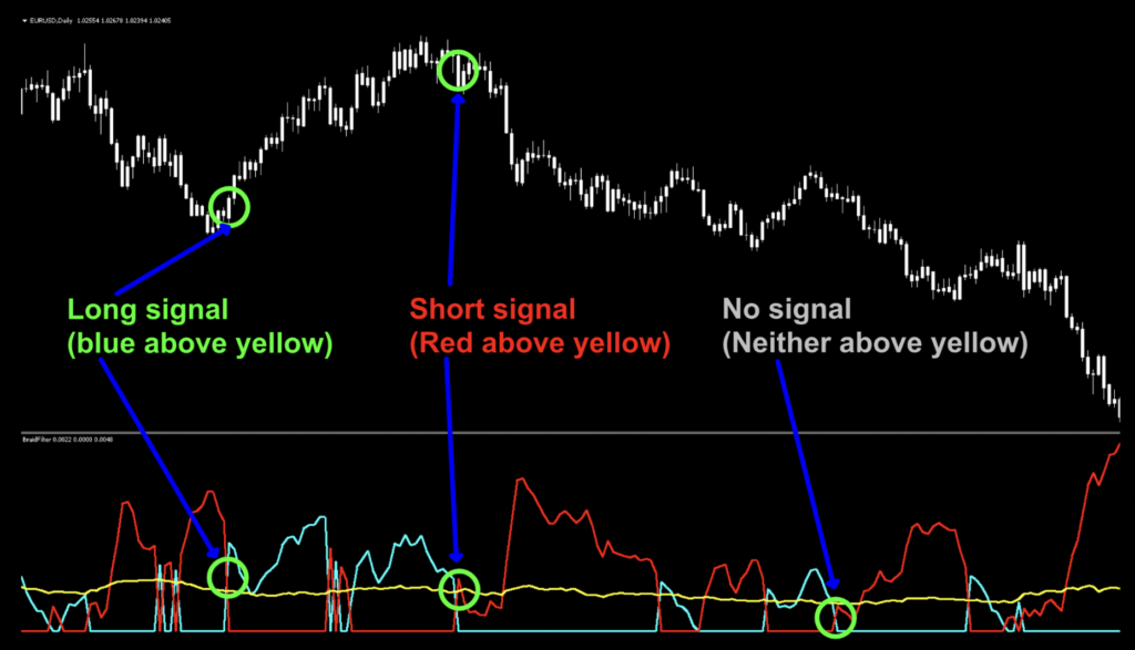 No Signal: Red crosses Blue (or Blue Crosses Red) under the yellow separation line. Until one or the other signal line crosses over the yellow separation line, no signal exists.