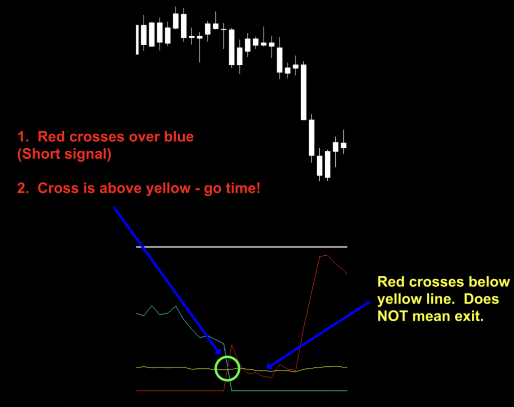 On the third cross, you would have waited for the red line to cross over the yellow and if everything else was in agreement, you would enter a short trade.