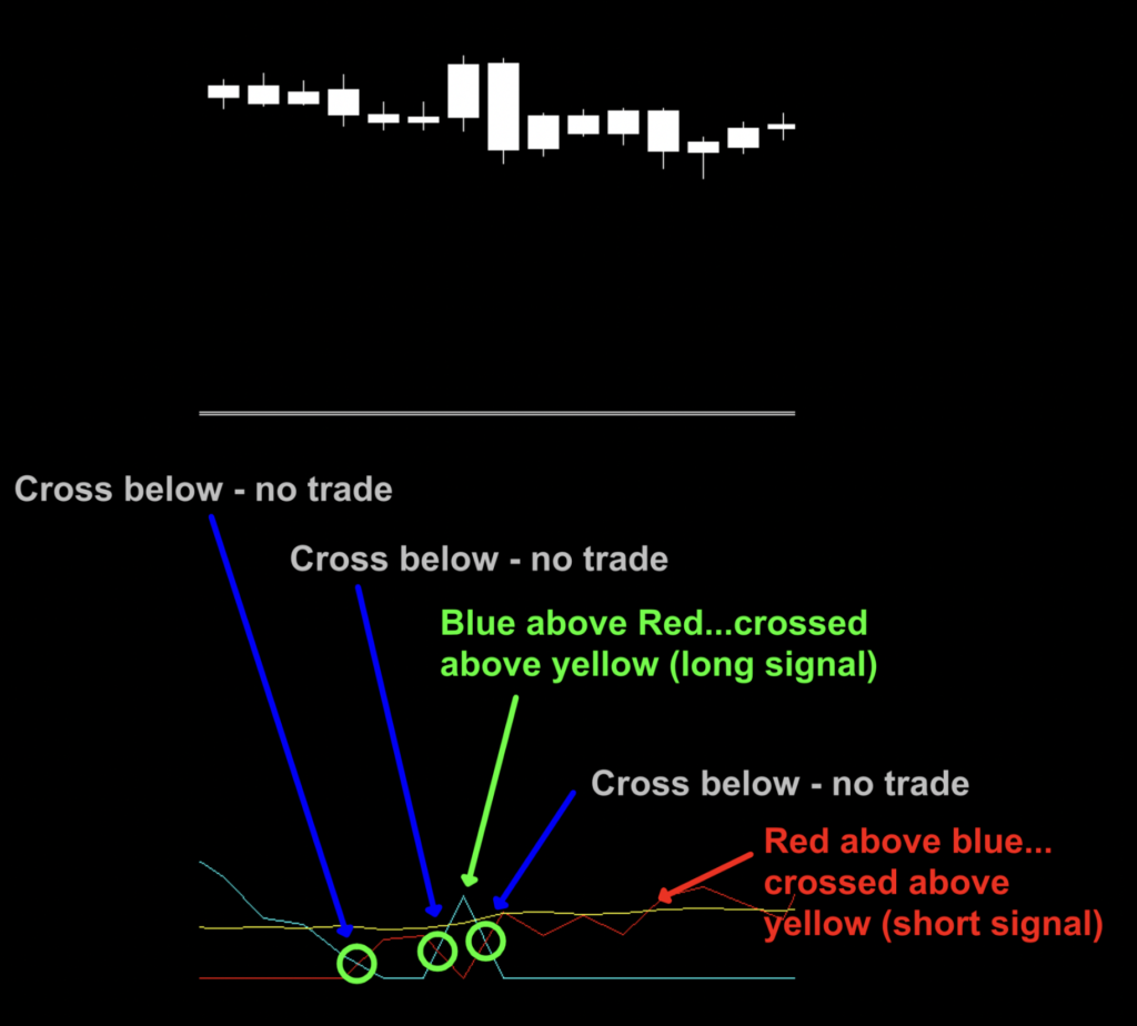The first two crosses are both below the yellow, and neither line extends past the yellow – no trade. However, after the second cross, the blue line extends beyond the yellow – long trade. But then it crosses below the red only a few periods later. What does that mean? If you’re using this indicator strictly as an entry indicator, you are long. If you want to use it as an exit indicator, then you would exit after the third cross and when the red signal line crosses over the yellow.