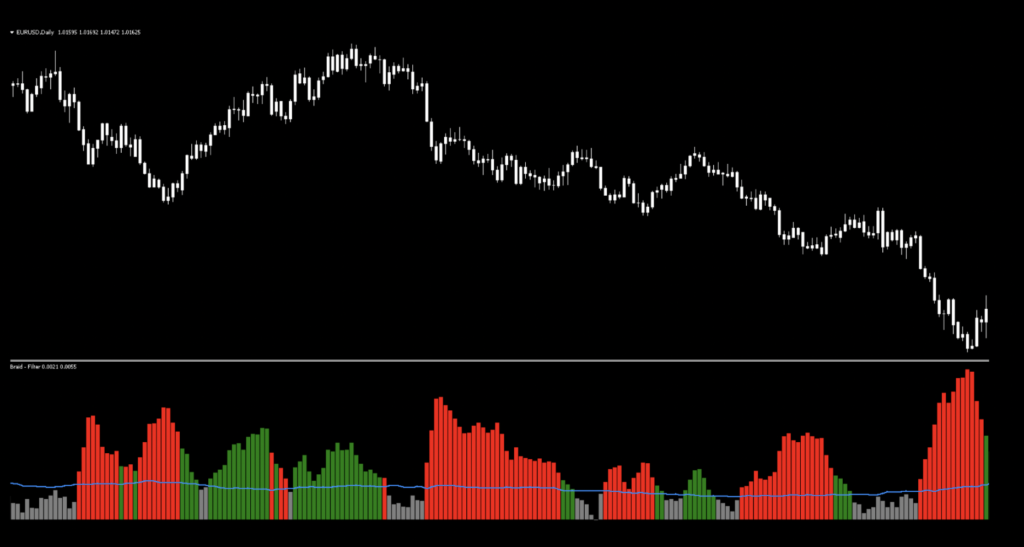 This last version of the Braid Filter is probably the easiest to use because it actually lives on the price portion of your chart. It has the same colors as the histogram (with no filter line). Let’s take a look.