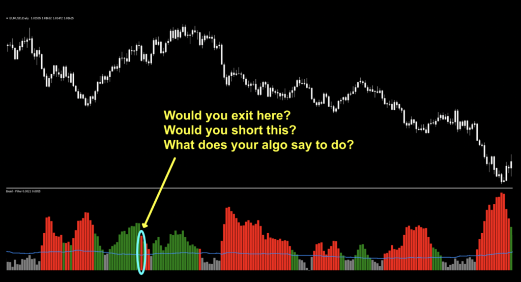 This indicator is considered a “confirmation indicator” which falls into the category of indicators that serve as an initial checkpoint after the baseline indicator provides you with a foundational signal. You’ll also notice that the original Braid Filter, is a “below chart” indicator.