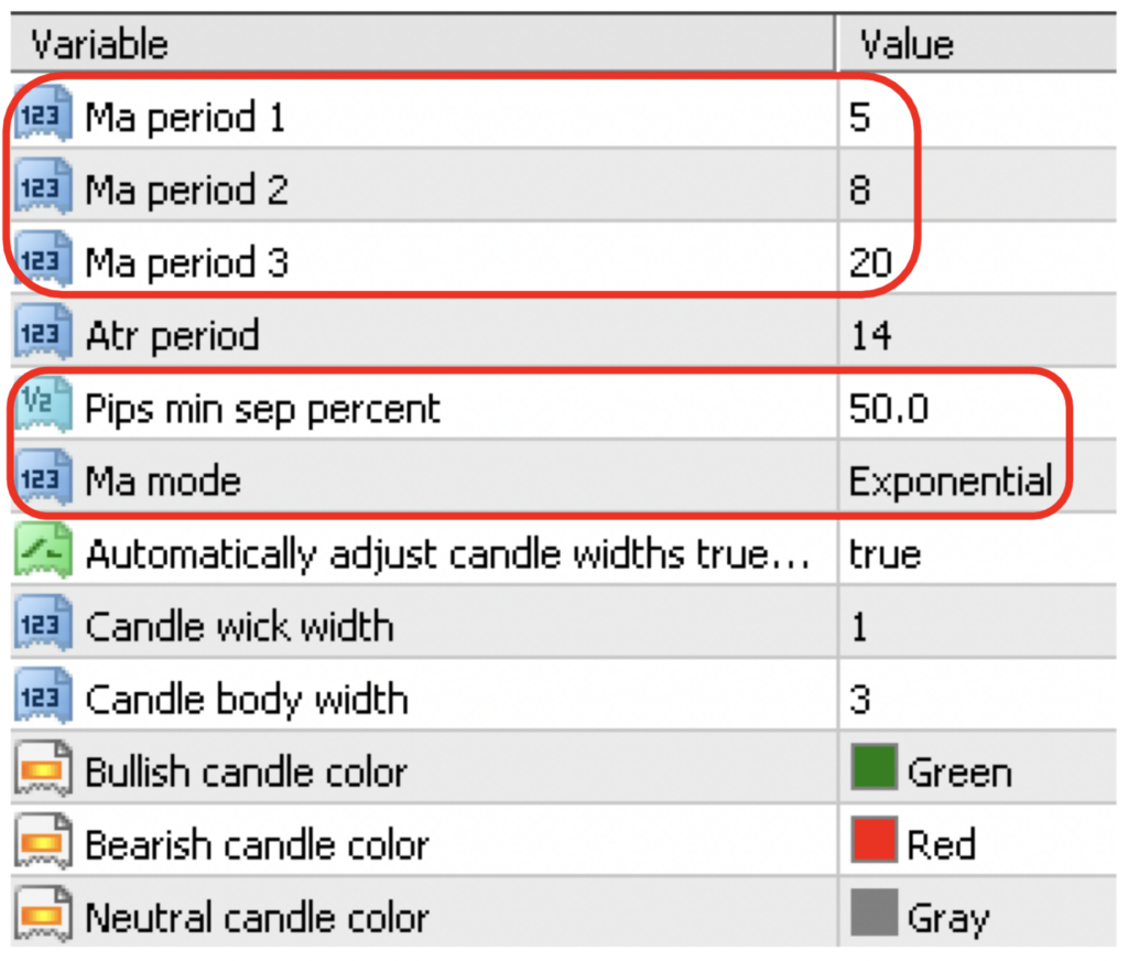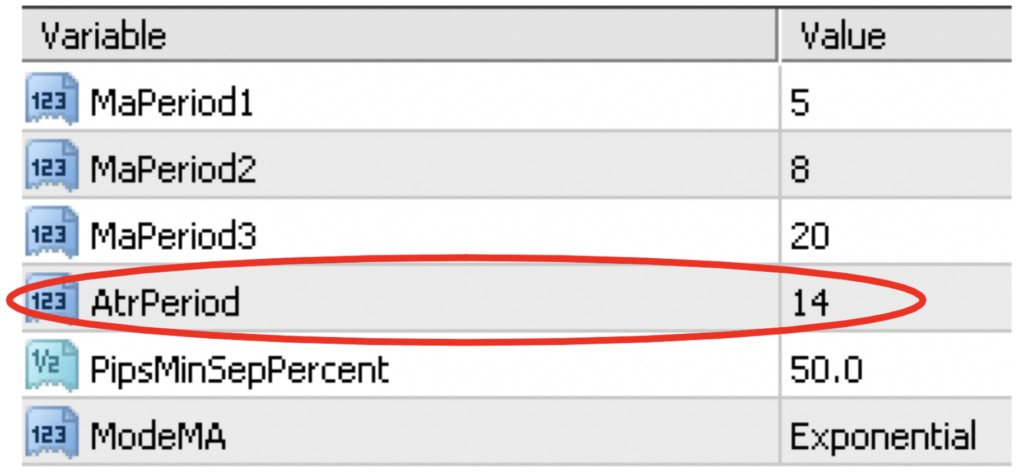 Below are the settings for the second version. Note they’re identical to the original, except for one additional variable; ATR.