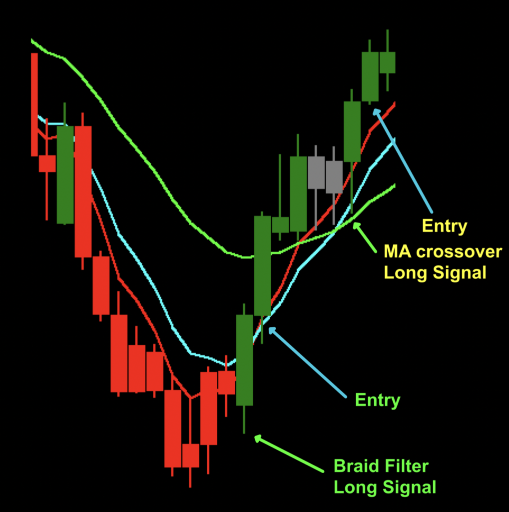 The “braid” is formed by intersections of lines based on different types of moving averages. “Big deal, that’s old stuff…”, you’d say; and you’d be right because moving averages are one of the oldest (if not the oldest types of indicators) on the planet.