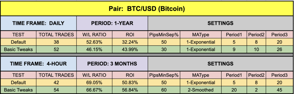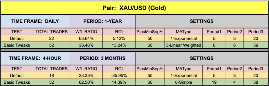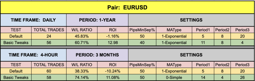 The green highlighted rows represent “basic tweaks” on the settings which returned better results. Are these the best? Not necessarily. Given that variables including testing date range and broker data are different from person to person, you may find better settings.