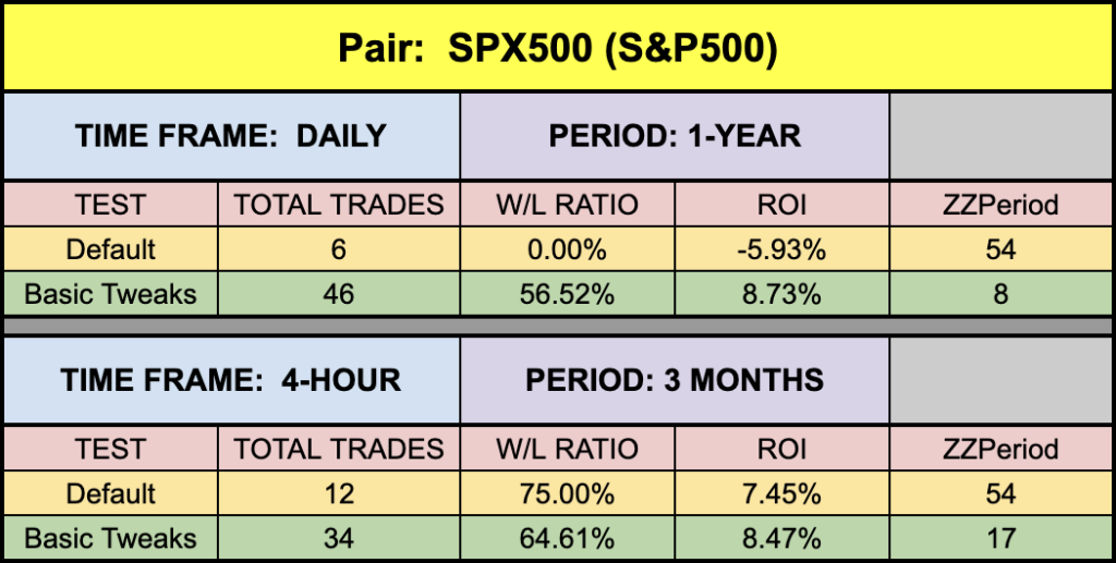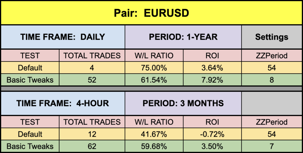 The green highlighted rows represent “basic tweaks” on the settings which returned better results. Are these the best? Not necessarily. Given that variables including testing date range and broker data are different from person to person, you may find better settings.