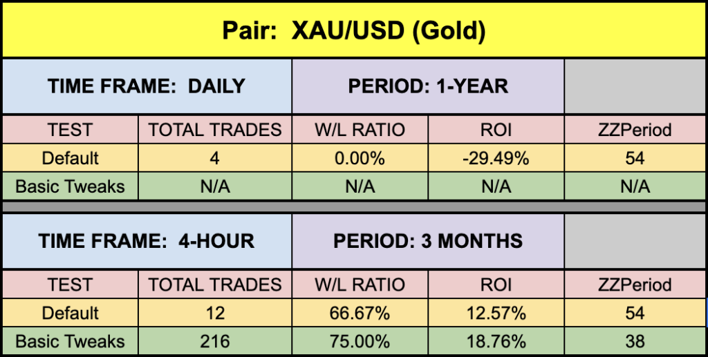 *NOTE:  During the three-month period where we tested the XAU/USD on the 4-hour time frame, there were no possible settings that returned a positive ROI.  This happens from time to time, and in that case, just move on to another indicator if that’s what you trade.  This is not a big deal.