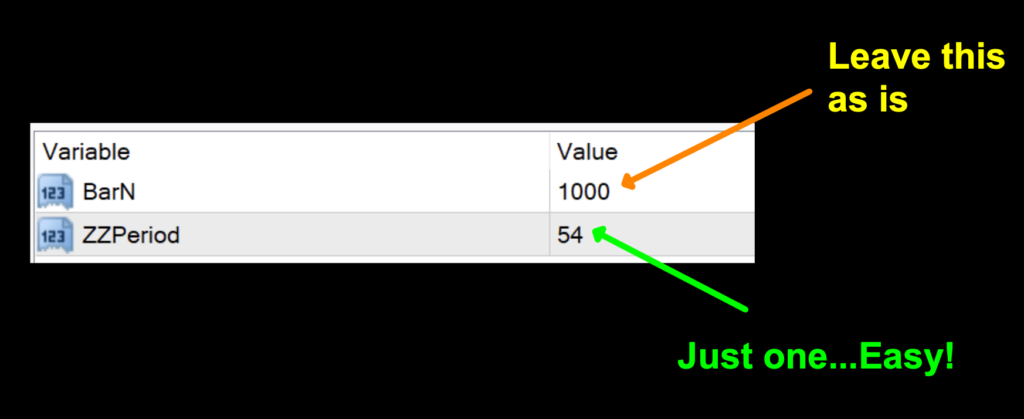 BarN:  The number of bars the indicator will draw back to in history.  For our testing purposes, 1000 is sufficient, so it doesn’t need to be changed.