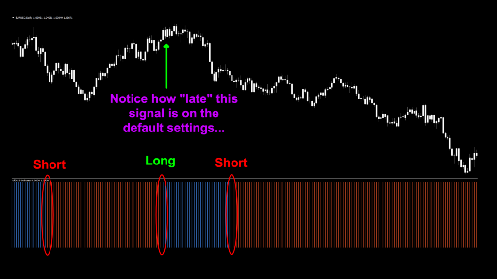 Notice how late that long signal is on the default setting.  That’s fine.  The beautiful thing about this indicator is that with only one variable to change and the visual ease it offers, finding better signals can be a much quicker endeavor than with other indicators.  We like those!  But…look at that second short.  Yes, it’s a little late – but look how long it kept you in a trade.  That’s pretty cool too.