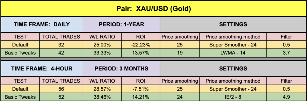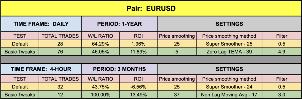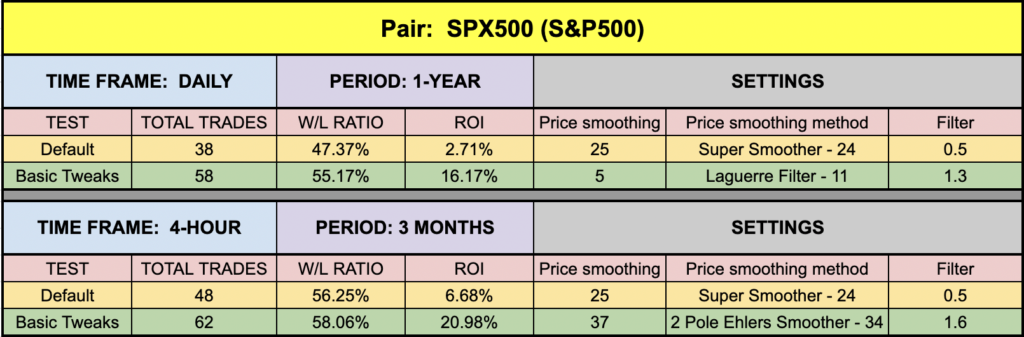 The green highlighted rows represent “basic tweaks” on the settings which returned better results. Are these the best? Not necessarily. Given that variables including testing date range and broker data are different from person to person, you may find better settings.