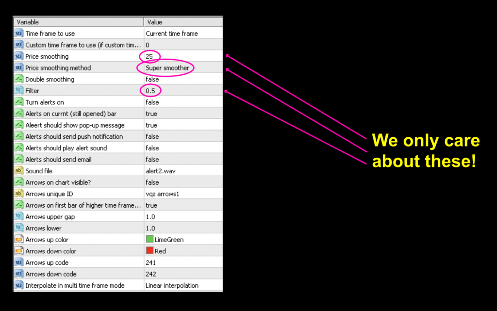 Price smoothing method: This is the type of moving average calculation. There are 40 different varieties. The default setting is “Super smoother”.