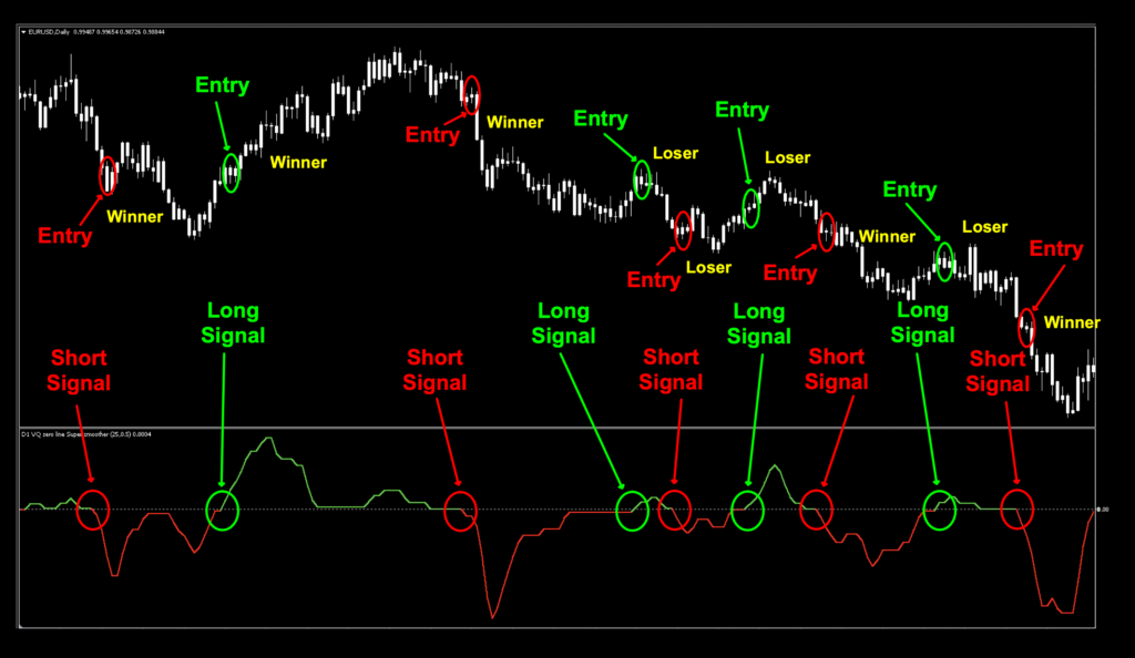 Short signal – When the signal line crosses below the “zero line” and turns red, the entry occurs on the open of the next candle.