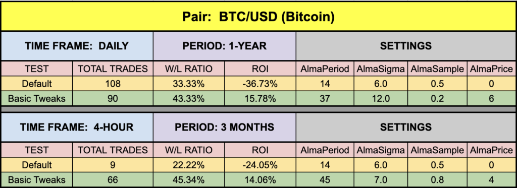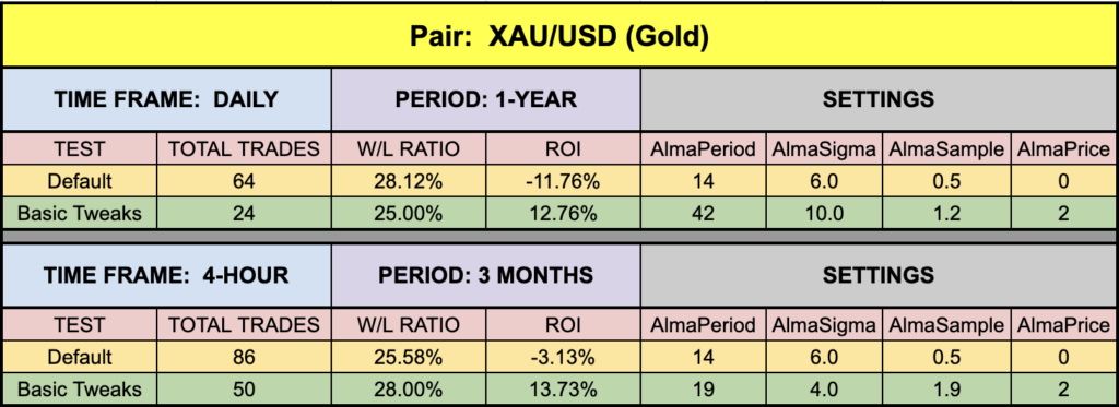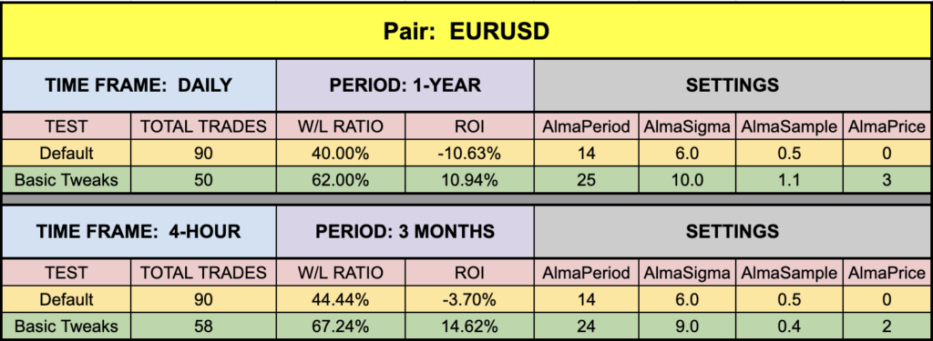 The green highlighted rows represent “basic tweaks” on the settings which returned better results. Are these the best? Not necessarily. Given that variables including testing date range and broker data are different from person to person, you may find better settings.