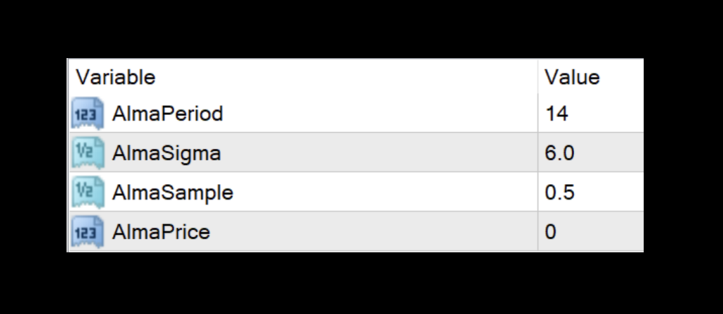 AlmaSample: This is the Gaussian filter setting. By changing this setting, you “flex” the signal line by adjusting its moving average behavior. The default value is 0.5.
