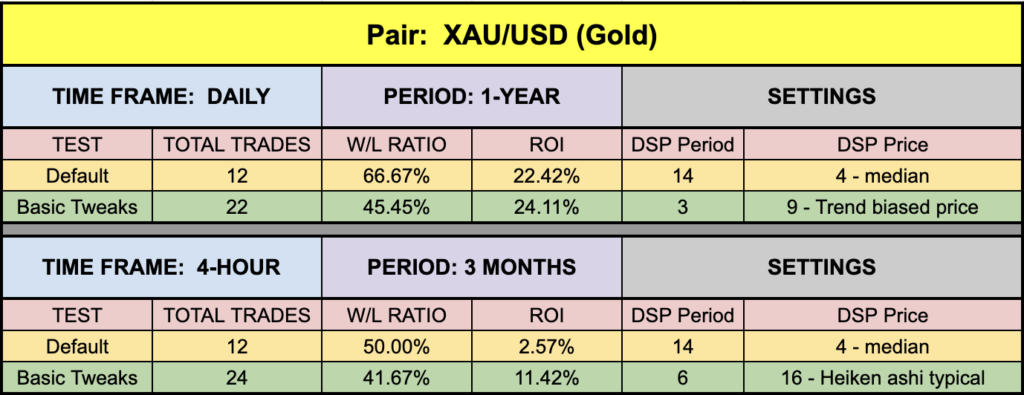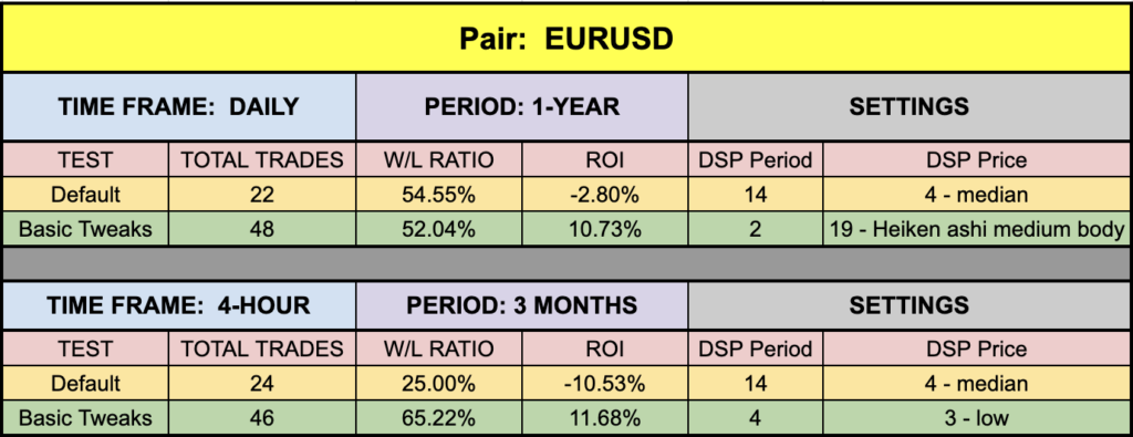 The green highlighted rows represent “basic tweaks” on the settings which returned better results. Are these the best? Not necessarily. Given that variables including testing date range and broker data are different from person to person, you may find better settings.