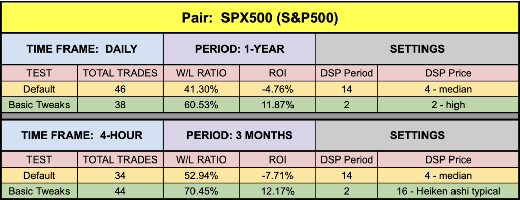 As No Nonsense Traders – and therefore Swing Traders, we will not examine shorter time frames in these studies. We will also run an additional test, using different values for the settings, to analyze which one may work better and examine the following results: