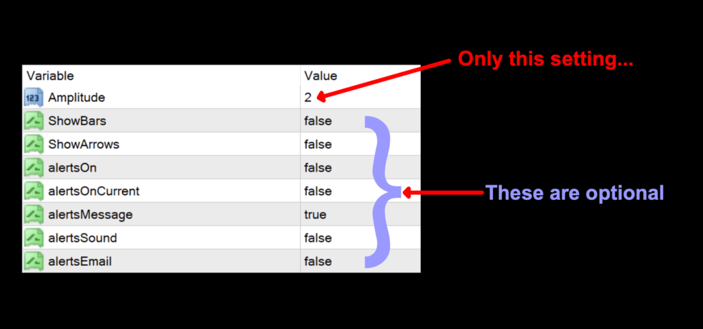 This indicator has a few of variables in the settings window, and we’ll use only the first one for our testing purposes. We’ll talk briefly about the others later. Below is the settings screen.