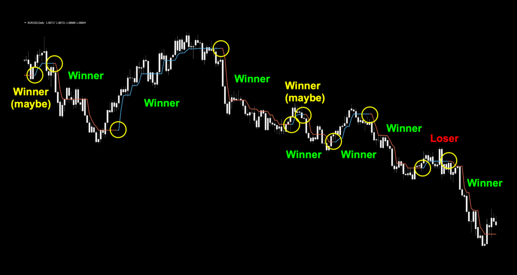 While we couldn’t find the exact formula to create the signal line, we did peek into the code. There are various moving averages, ATR, a smattering of price point references, and a few other sprinkles of various items which comprise the indicator’s “guts”. You can always peek at the code using the MT4 MetaEditor, if you’re so inclined. We just like the pretty colors…