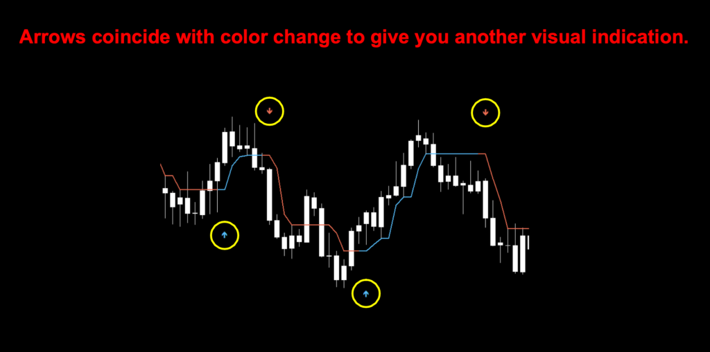 There are a few settings which do not directly affect the indicator’s signals. These revolve around the use of arrows to direct you to signals and alert functions. Indicators which have alert functions provide you with the ability to text, email, or “pop-up” on your screen with a notification and even sounds, if you desire. We’ll address some of these in the MT4 playlist on the Stonehill Forex YouTube channel. If you turn the arrows to “true”, it looks like this.