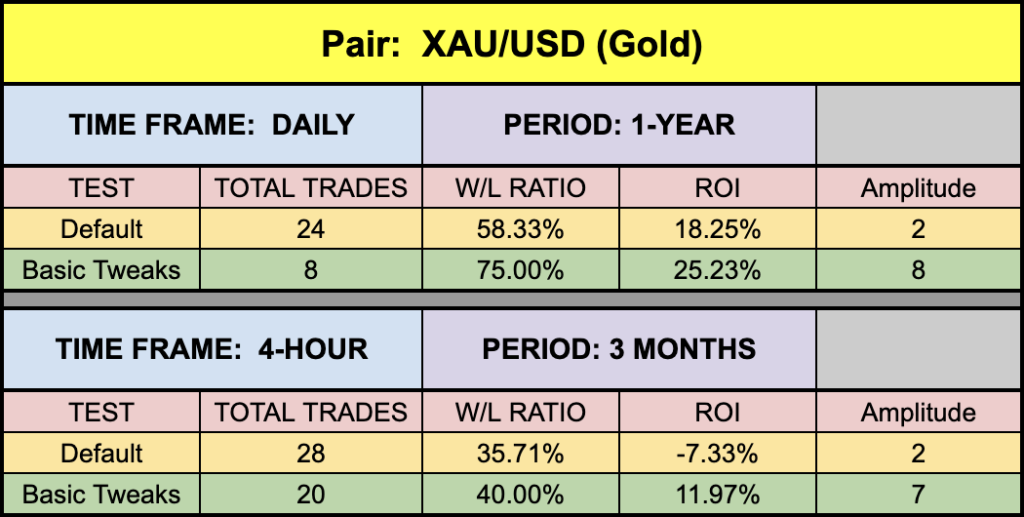 The green highlighted rows represent “basic tweaks” on the settings which returned better results. Are these the best? Not necessarily. Given that variables including testing date range and broker data are different from person to person, you may find better settings.